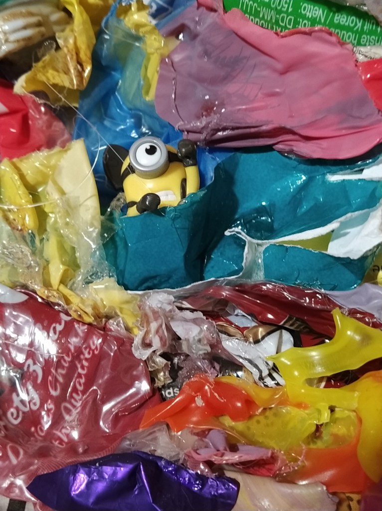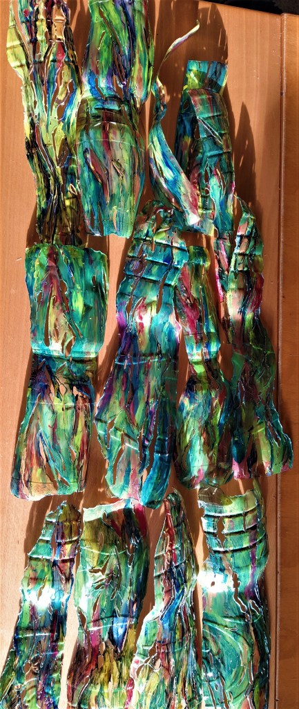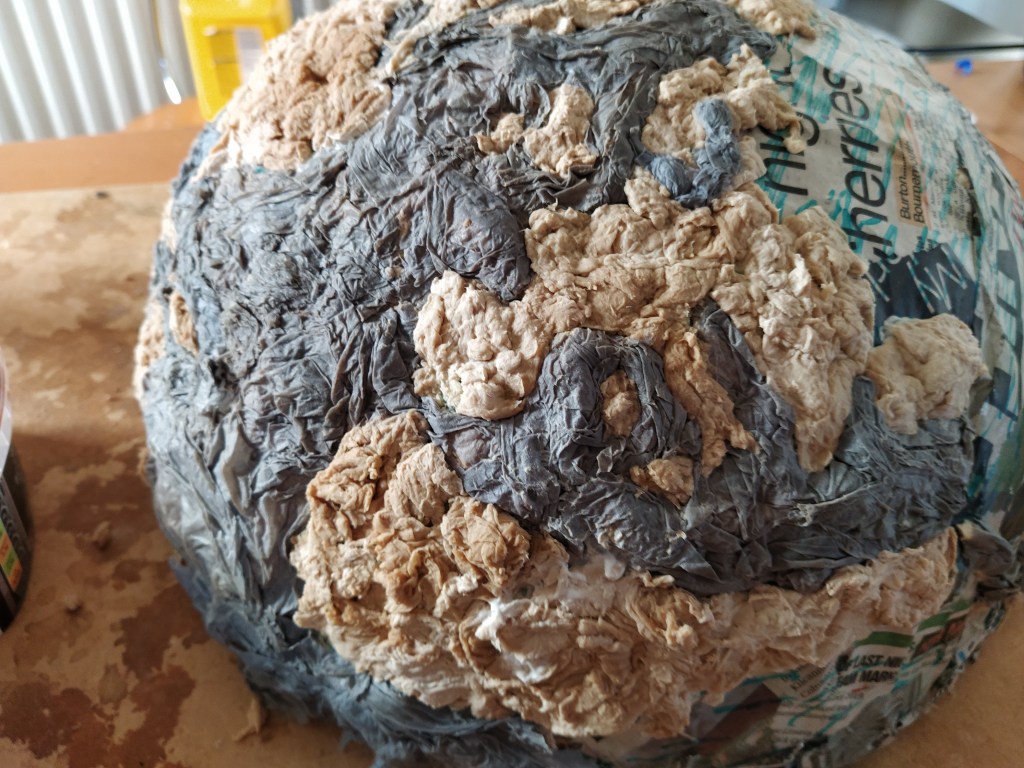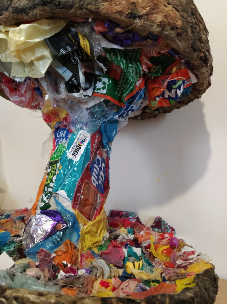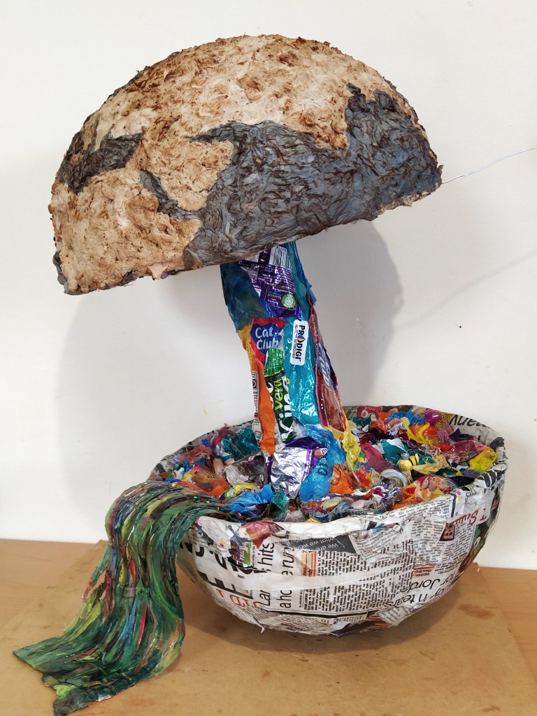 Papier mache, chicken wire, litter, found objects, plastic bottles