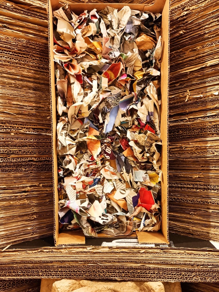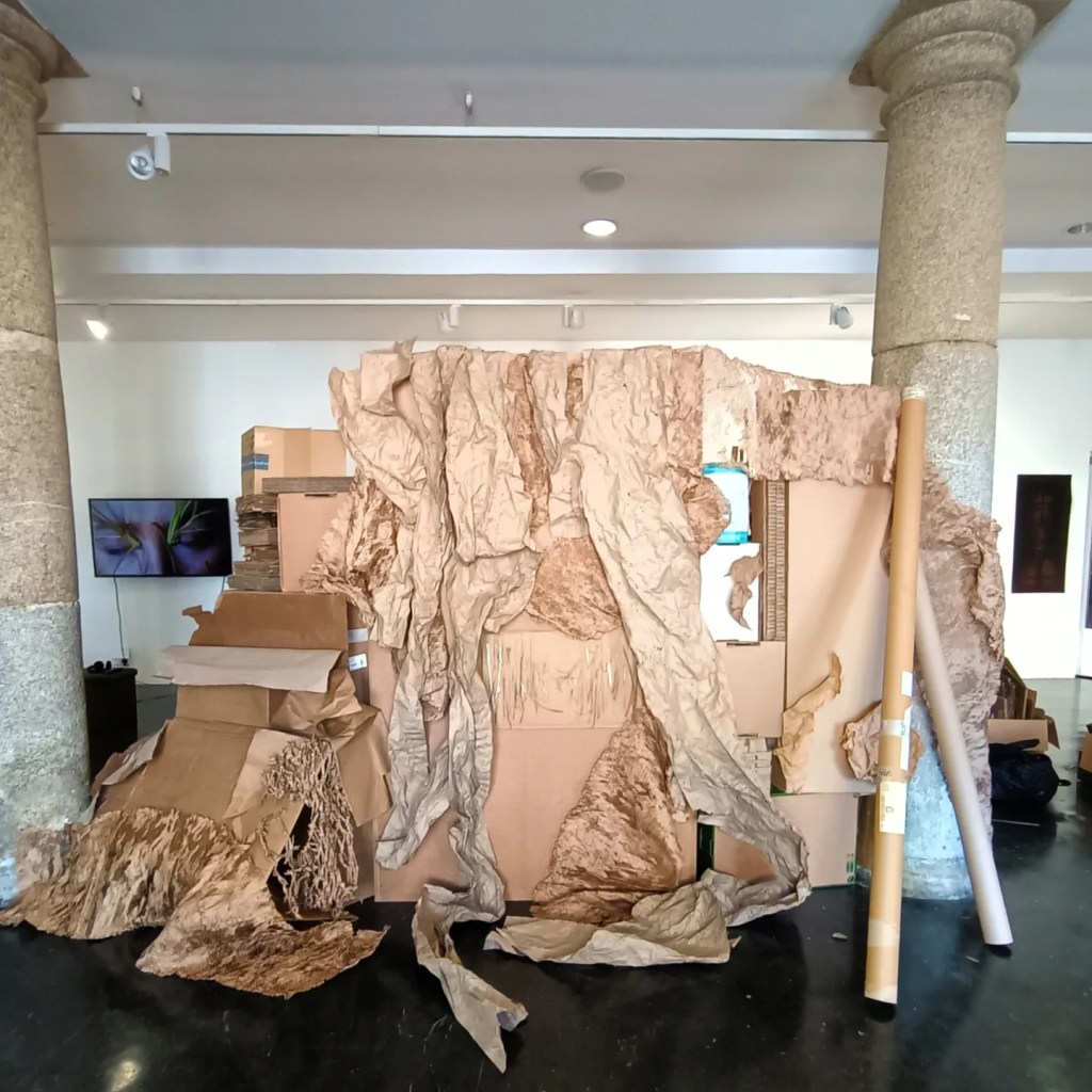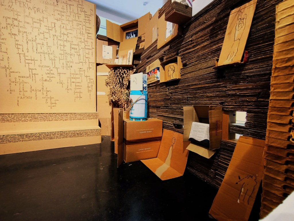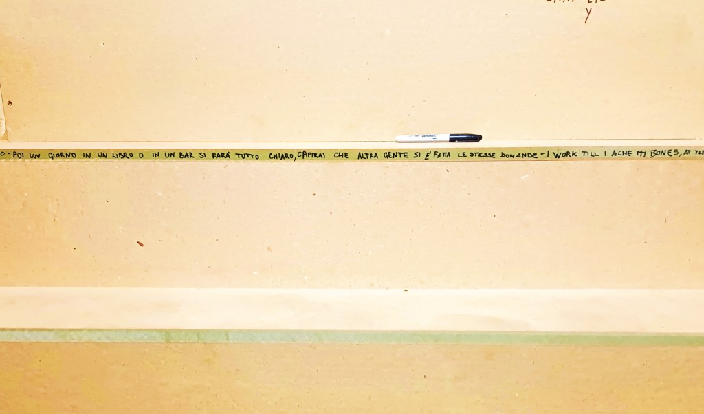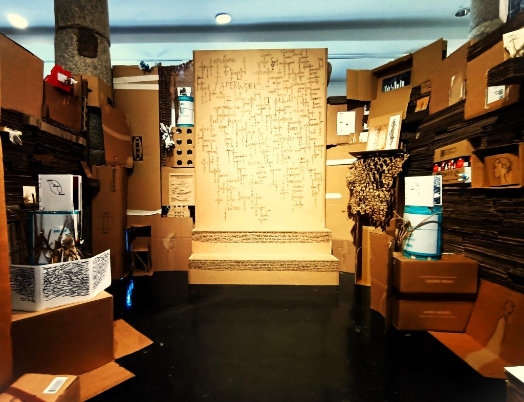 Paperwork and Words of Life aims to be a structural representation of how my brain works, almost an attempt to have the viewer directly step into it as I often find it difficult to express my train of thoughts in a coherent way as my mind has a tendency to follow many ideas at once. The original title for this installation was Connections, precisely because I wanted to transmit to the viewer how, sometimes, different ideas and approaches can contribute to a complex concept. The installation, mostly made out of cardboard and paper, includes various self-made books, where I show photographs, processes and experiments, tributes photographs, newspapers’ articles along with a live performance which consist in myself writing on the walls using the word-association technique which I use on a daily base as a way to brainstorm and possibly fundamental for the overall understanding of the work. With this work I’m exploring the relation and impact between the contemporary world on myself and on society as whole.